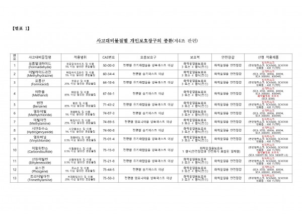 답변 사고대비물질별 개인보호장구의 종류(제4조 관련) 페이지 정보 작성자 (주)스니퍼 댓글 0건 조회 2,732회 작성일 16-11-06 15:17 본문 사고대비물질별 개인보호장구의 종류 답변 이전글용기 및 특정설비의 재검사기간(제39조 관련) 16.11.06 다음글사고.대응 대비_사고발생신고(법43조) 16.09.17 댓글목록 댓글목록 등록된 댓글이 없습니다.